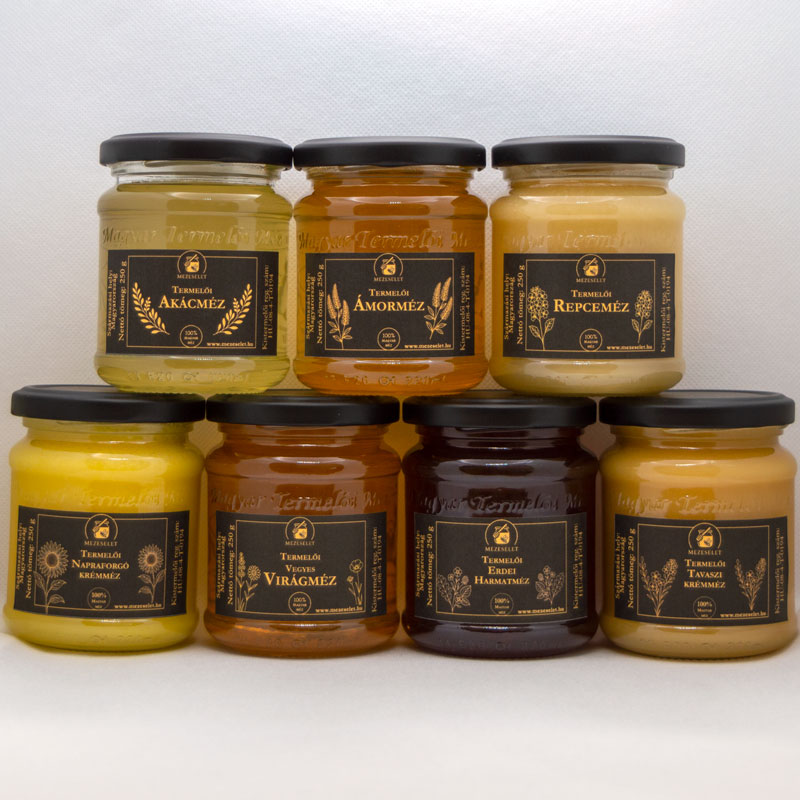 Webáruházunkban jelenleg 7 féle termelői méz kapható. Minden méz egyedi, a mézre jellemző motívummal díszített címkét visel.
