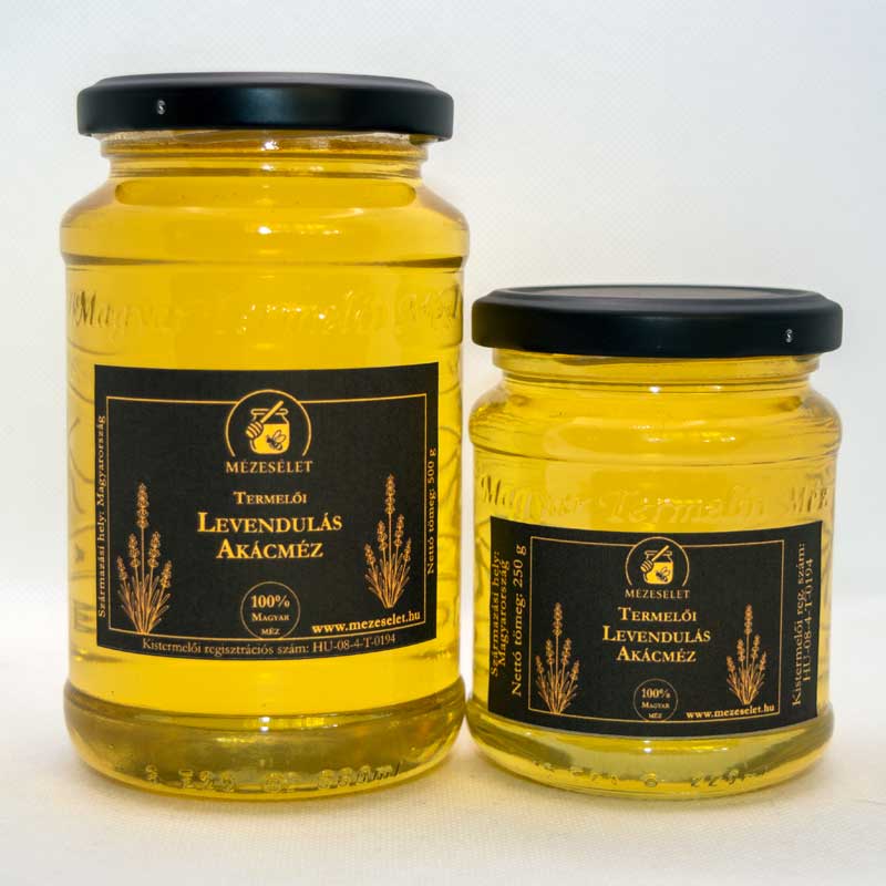 Levendulás akácmézünk kétféle méretű üvegben, 250 és 500 grammos kiszerelésben is kapható.