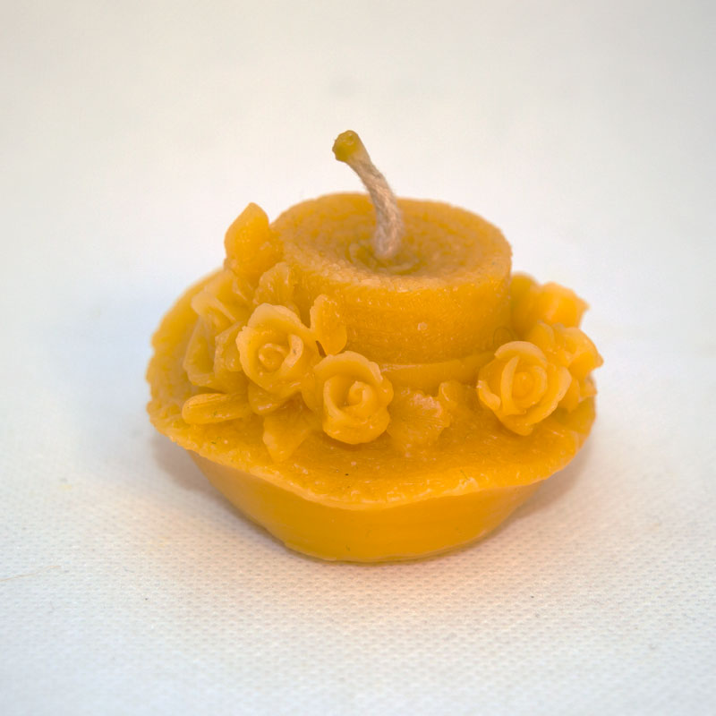 Nyíló rózsákkal díszített, masnis kalap alakú gyertya, igazi méhviaszból. Viszonylag alacsony, tömör gyertya, akár mécsesként is használhatod.