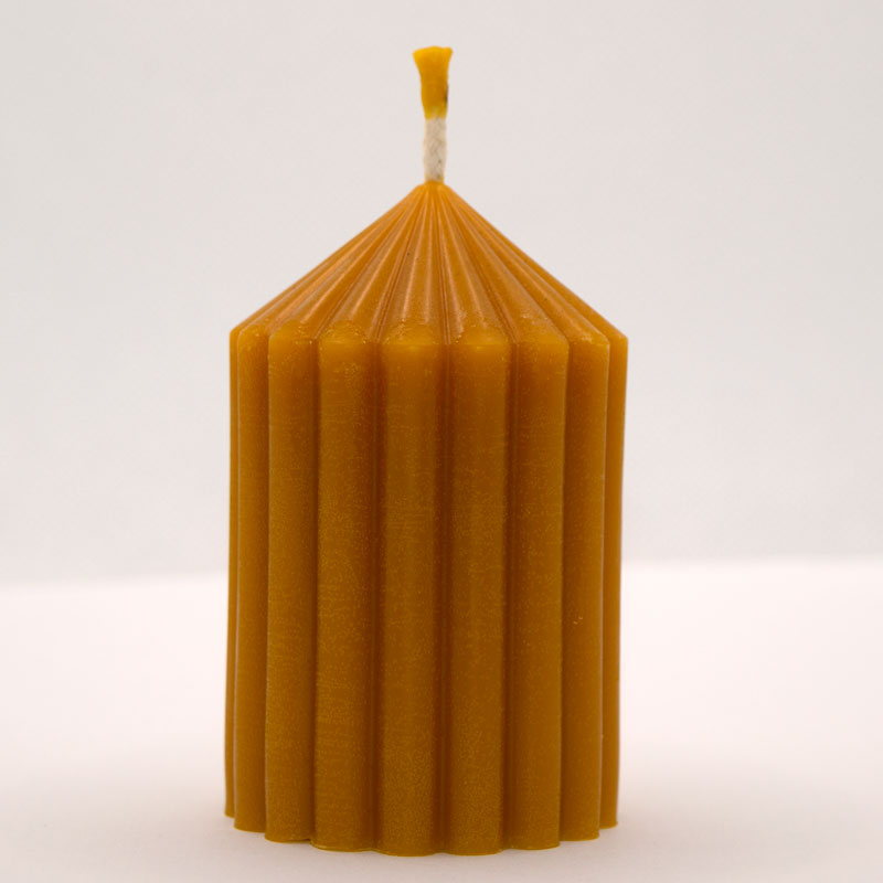 Clara dekor gyertyánk 8 cm magasságával nagyon hasonlít Jessy dekor méhviasz gyertyánkra. Viszont átmérője 5,5 cm, így ő nem magasságával, hanem szélességével tűnik ki. Mintázata ugyanaz, hosszú bordák futnak végig talpától egészen a kanócig. Akár önmagában, akár testvérével kombinálva remek adventi gyertya lehet ez a tömb gyertya. Egyszerűsége a szépsége.