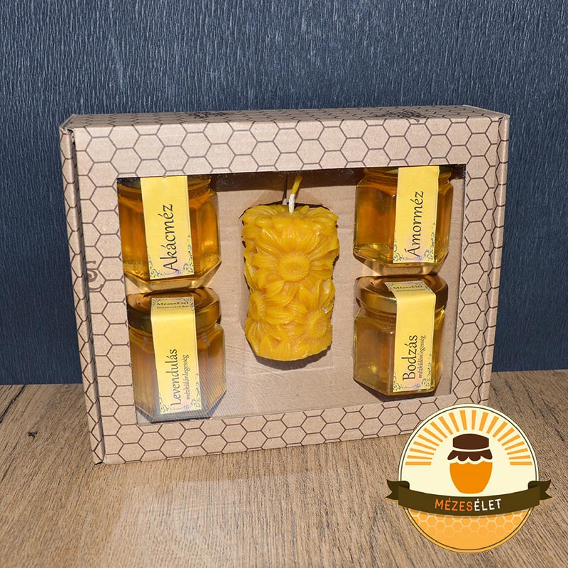 Különleges ajándékcsomagunk 4 fajta, általad választott mézet, valamint 1 db általad választott méhviasz gyertyát tartalmaz.