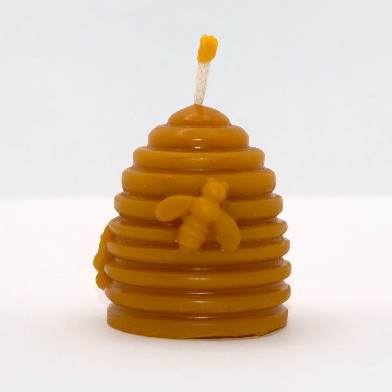 Régebbi időkben a méhészek ehhez hasonló méhkasokban tartották a méheket. Gyertyánkon 3 méhecske található, amint épp dolgoznak a kas körül. Tömör méhviaszból készült gyertya, mely hosszú ideig ég, ha meggyújtod.