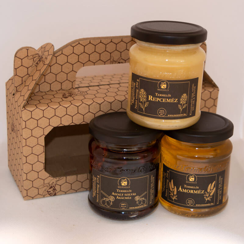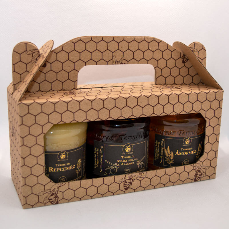 Díszdobozos mézválogatás három üveg mézzel – mézes ajándékcsomag minden alkalomra