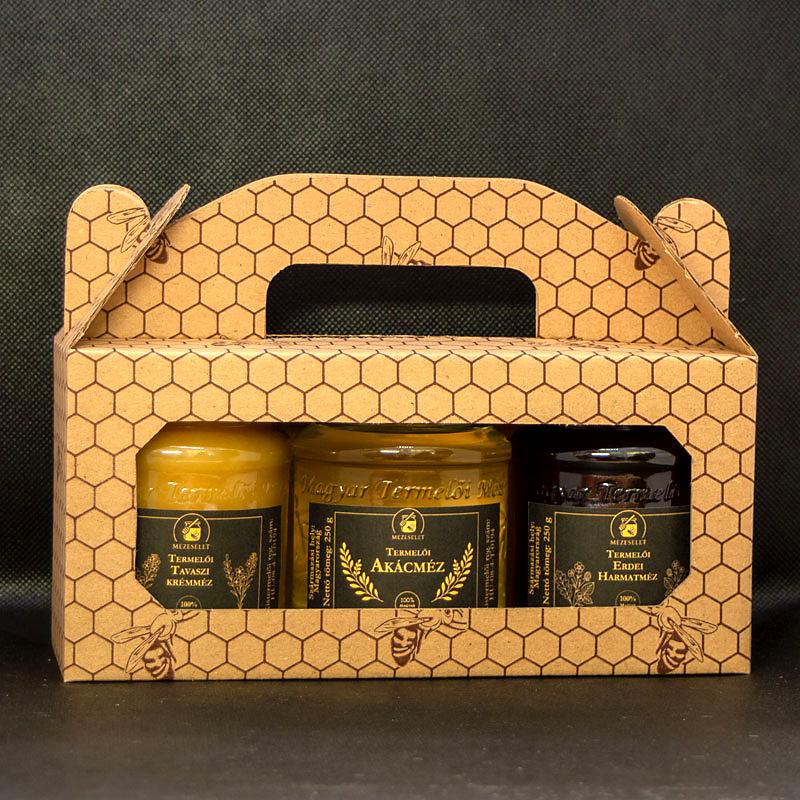 A díszdobozos mézválogatás tökéletes lehetőség, ha elegáns és természetes ajándékot keresel. A méhsejt mintázatú, kartonból készült díszdoboz három darab 250 g-os üveget rejt. Ezekbe hét különleges fajtaméz közül választhatsz: